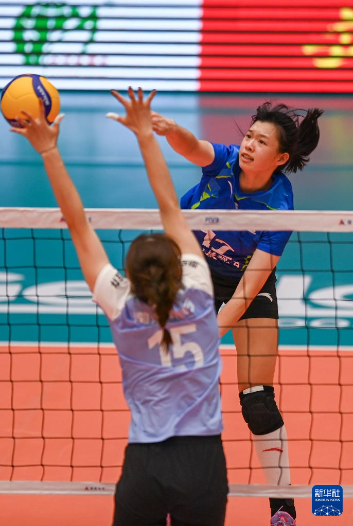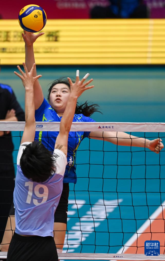 12月20日,福建安溪铁观音队球员张馨蕊(右)在比赛中扣球。
