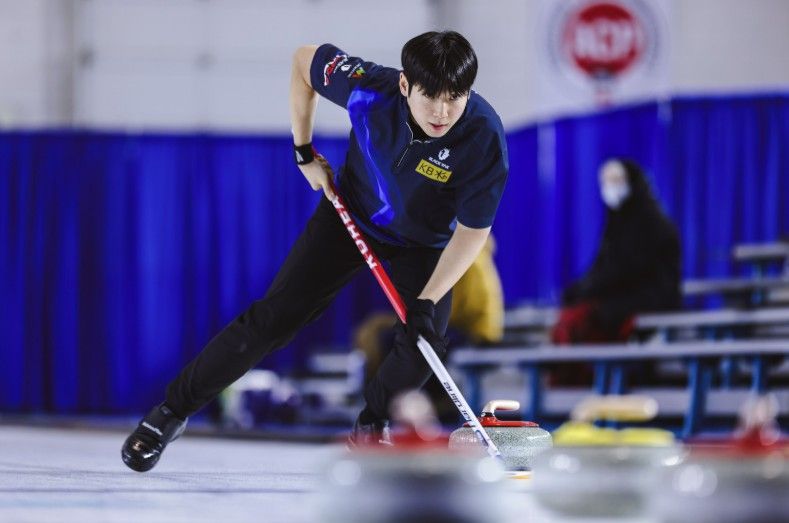 图为韩国队选手在18日比赛中。图片来自世界冰壶联合会官网
