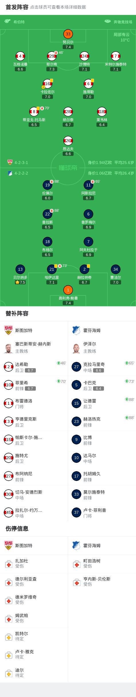 北京时间12月20日德甲日报德国足球顶级联赛 联赛 第15轮,斯图加特主场对阵霍芬海姆。最终比分斯图加特 0-0 霍芬海姆。