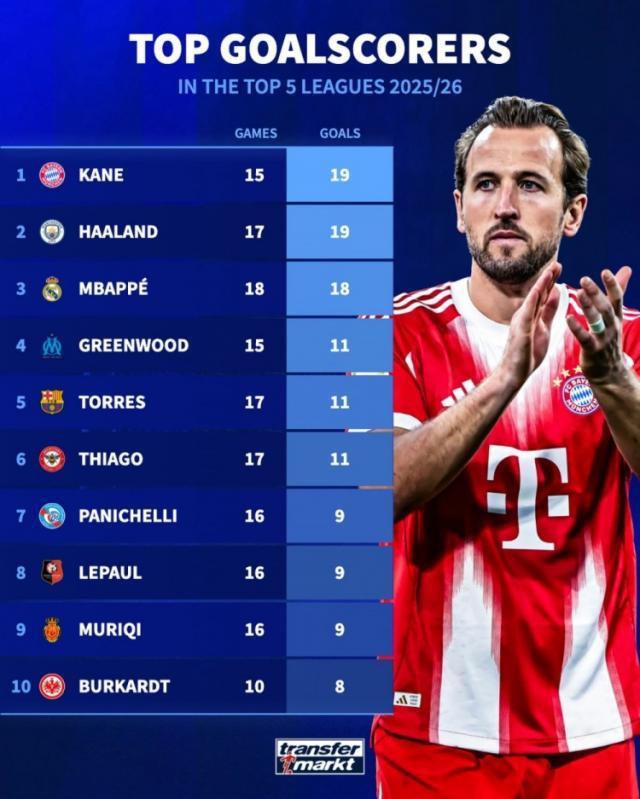 本赛季五大联赛射手榜:凯恩、哈兰德19球居首