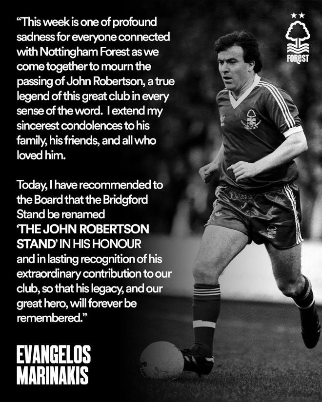 。为纪念俱乐部传奇,森林老板马里纳基斯提议用罗伯逊名字命名看台。