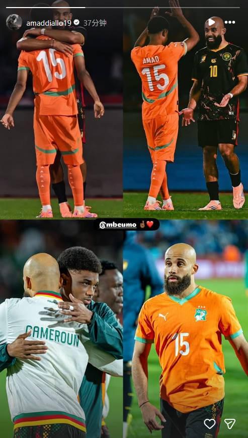 非洲杯科特迪瓦1-1战平喀麦隆,阿马德赛后晒与姆伯莫照片
