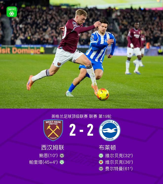北京时间12月31日英超日报,英格兰足球超级联赛第19轮展开角逐,西汉姆联坐镇主场迎战布莱顿。比赛伊始,帕奎塔助攻鲍恩率先破门,维尔贝克通过点球为布莱顿扳平比分。不久之后,维尔贝克再次主罚点球,但未能命中。上半场补时阶段,帕奎塔点射帮助西汉姆联再度领先。进入下半场,费尔特曼抓住机会打入一球,为布莱顿扳平比分。最终,双方以2比2握手言和。
