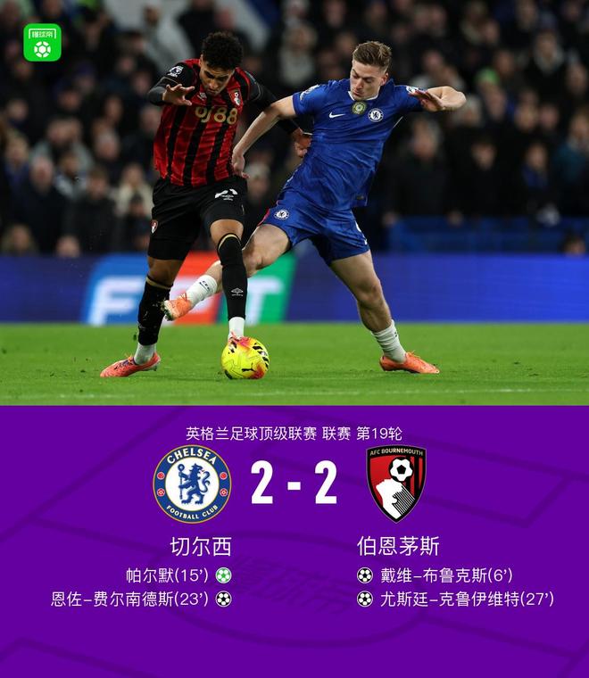 北京时间12月31日英超日报英格兰足球顶级联赛 联赛 第19轮,切尔西主场对阵伯恩茅斯。上半场,布鲁克斯率先破门。埃斯特旺造点,帕尔默点射扳平比分。加纳乔助攻,恩佐劲射建功。随后,小克鲁伊维特为客队扳平比分。下半场,两队均无建树。全场比赛结束,切尔西2-2战平伯恩茅斯,遭遇英超联赛3轮不胜。