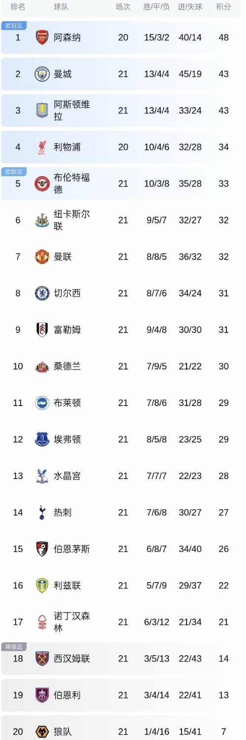 北京时间1月8日英超日报,英超联赛第21轮结束多场比赛的争夺,几支豪门球队相继翻车丢分,对于阿森纳来说极为有利,枪手有望扩大领先优势,剑指英超冠军。英超一夜5场冷门!曼城3连平,曼联+切尔西换帅白搭,积分榜大乱。