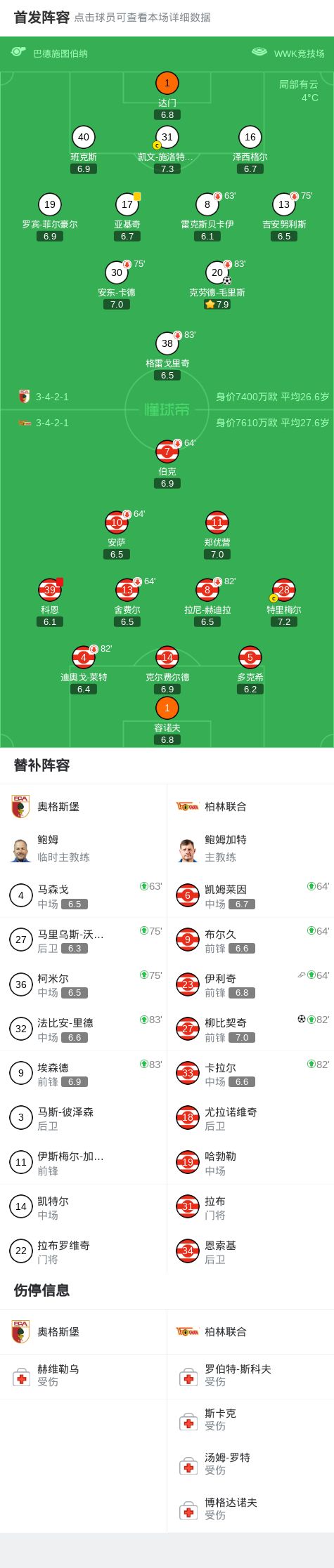 奥格斯堡1-1柏林联合,克劳德-毛里斯先拔头筹,柳比契奇扳平