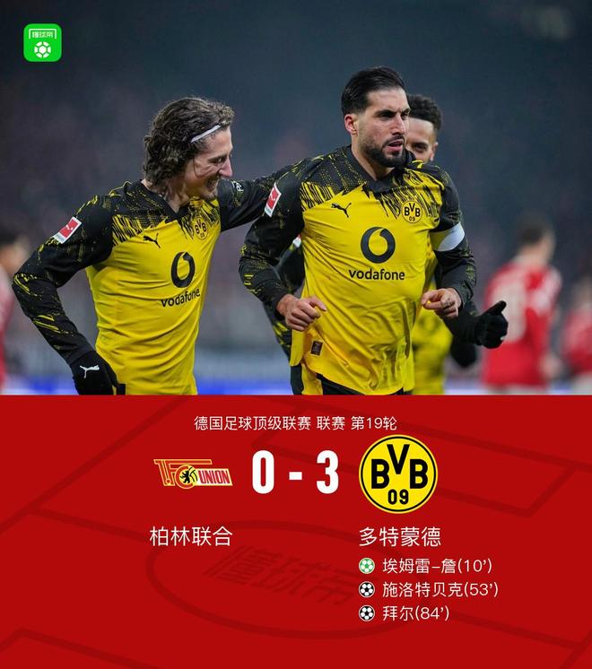 北京时间1月25日德甲日报,德国足球顶级联赛第19轮,柏林联合主场对阵多特蒙德。埃姆雷-詹主罚点球命中,为多特蒙德首开纪录;随后瑞尔森送出助攻,施洛特贝克破门扩大比分;乔布-贝林厄姆送出助攻,拜尔再入一球。最终多特蒙德客场3比0战胜柏林联合。