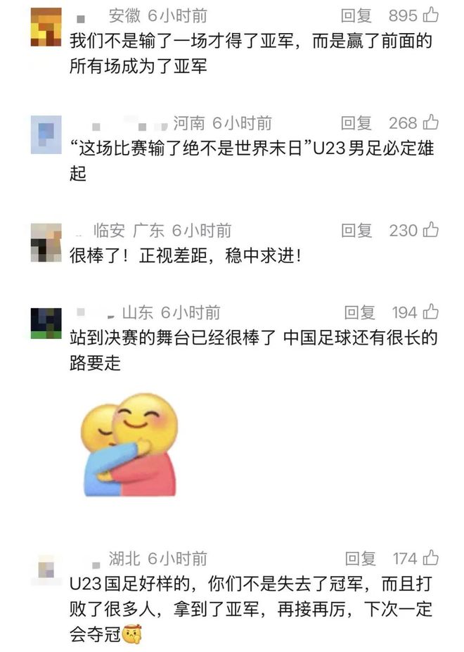 记者注意到,有不少网友陪伴U23国足至深夜,并第一时间留言,中国队不是输了一场比赛才成为亚军的,是赢了很多场比赛成为的亚军!