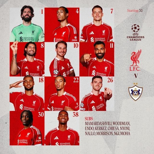利物浦vs卡拉巴赫:萨拉赫、维尔茨首发,罗伯逊、加克波出战